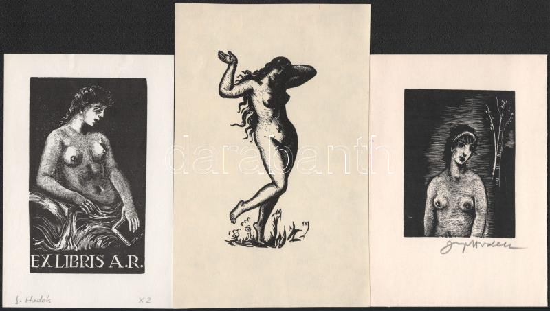 Josef Hodek (1888-1973): 3 db erotikus ex libris és kisgrafika. Klf. technikák, papír, egyik jelzett, klf. méretekben. Kettő hátoldalán paszpartuzás nyomaival.