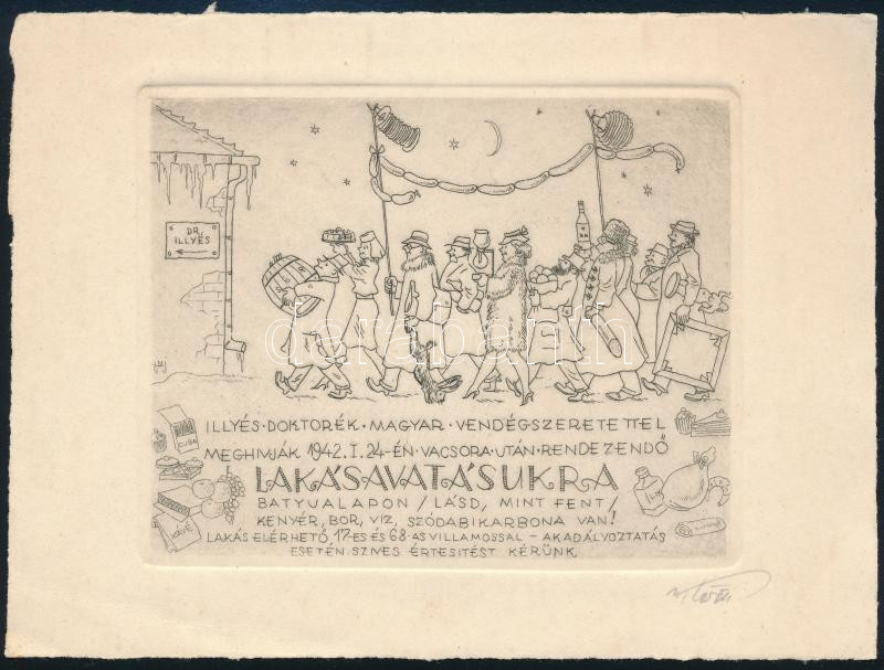 Olvashatatlan jelzéssel: Dr. Illyés lakásavató, rézkarc, papír, jelzett, 9×11,5 m