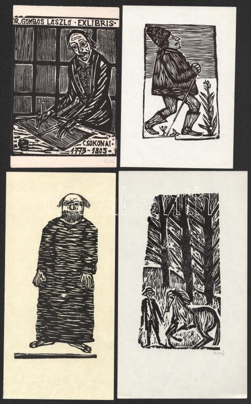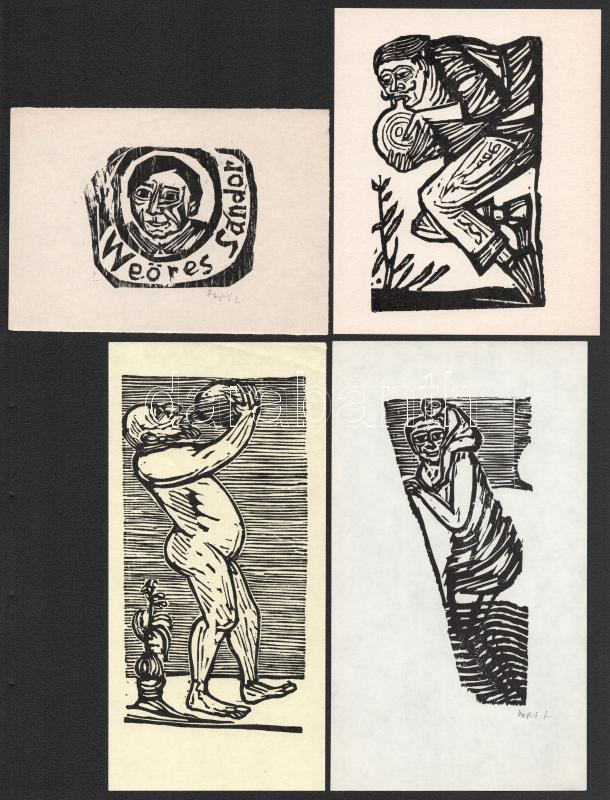 Perei Zoltán (1913-1992) : 8 db ex libris és kisgrafika (közte Weöres Sándor). Fametszet, papír, egy kivételével mindegyik jelzett. 7x8 és 16,5x8,5 cm közti méretekben.