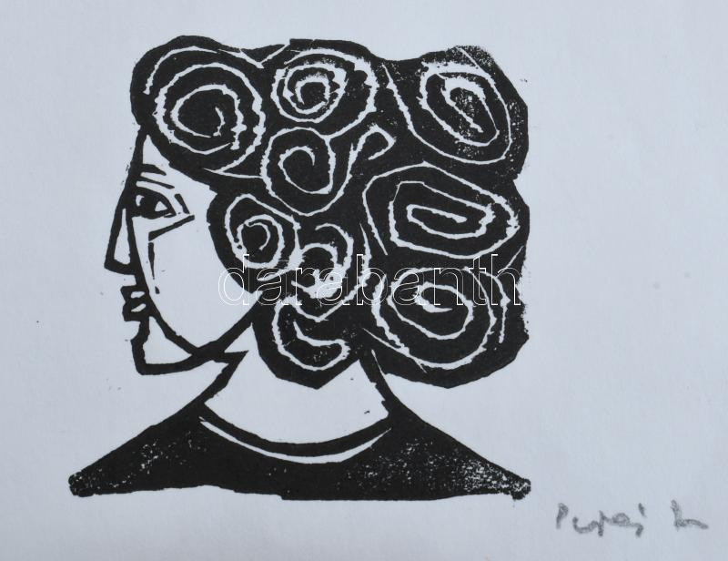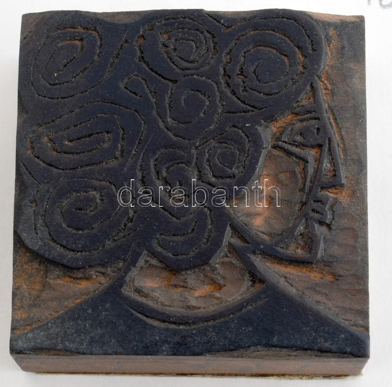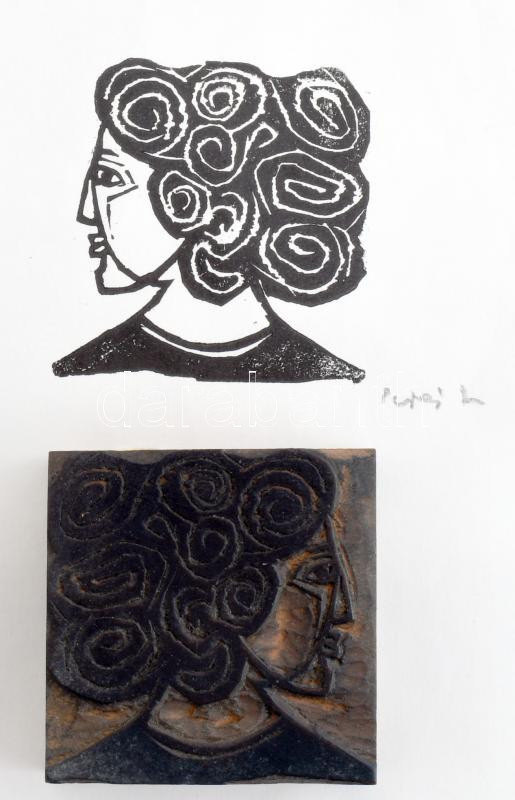 Perei Zoltán (1913-1992): Női fej fa nyomódúc. A tételhez tartozik a fametszet, papír. Jelzett. Borítékra ragasztva. 5x5x2 cm.