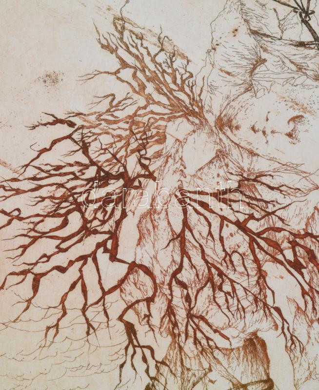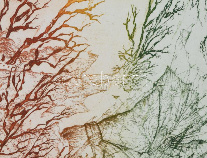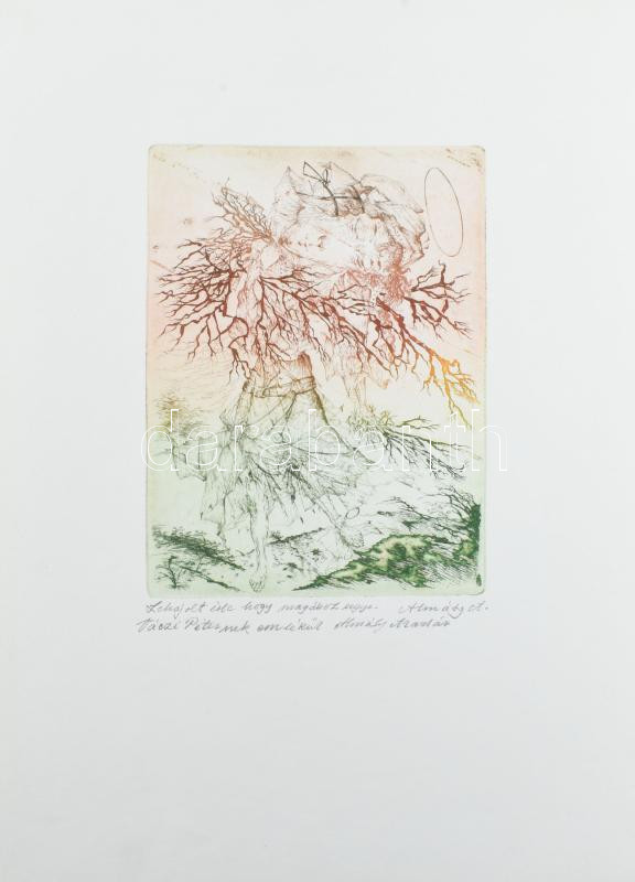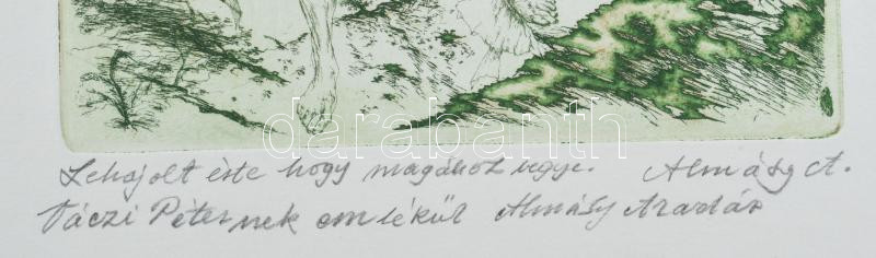 Almásy Aladár (1946-): Lehajolt érte, hogy magához vegye. Színes rézkarc, papír, jelzett. Almásy Aladár autográf ajánlásával. 20,5x15 cm