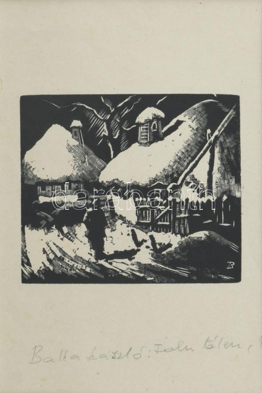 Balla László (1906-): Falu télen (Erdély). Fametszet, papír. Jelzett. Üvegezett fakeretben. 8x10 cm.