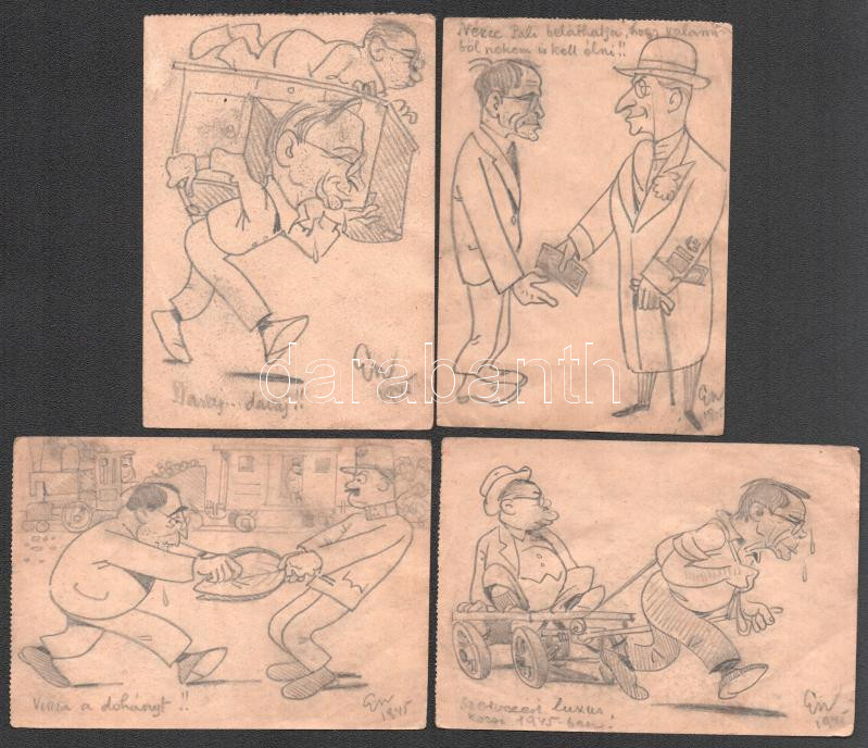 Endrődi István (1920-1988): 4 db karikatúra, 1945. Ceruza, papír. Mindegyik jelzett. 9,5x14 cm