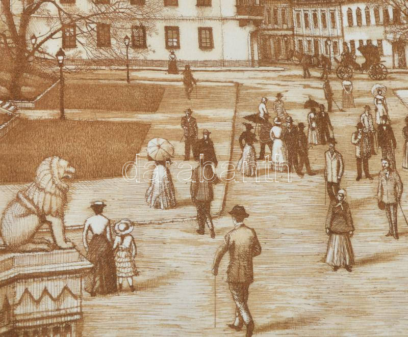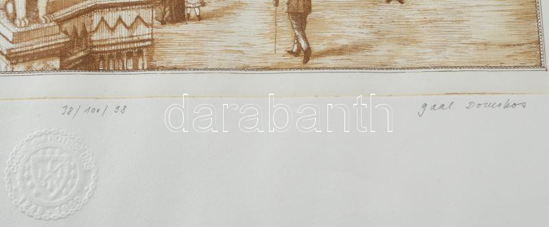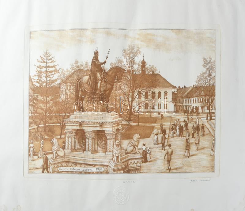 Gaál Domonkos (1940-2009): Budai vár Szent István király szobra. Színes rézkarc, papír, jelzett, sorszámozott 26x37 cm
