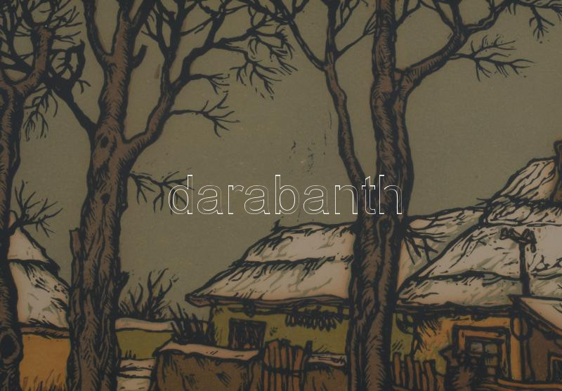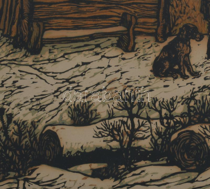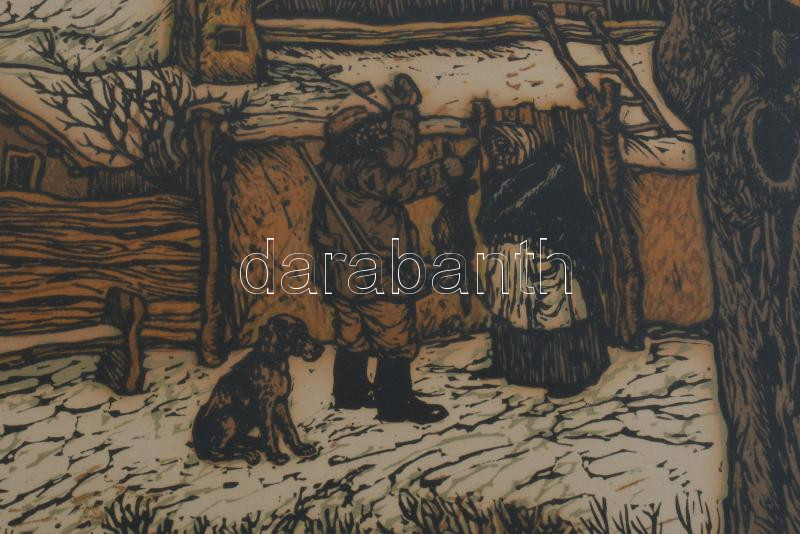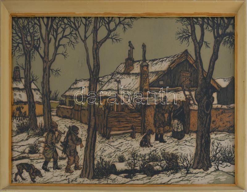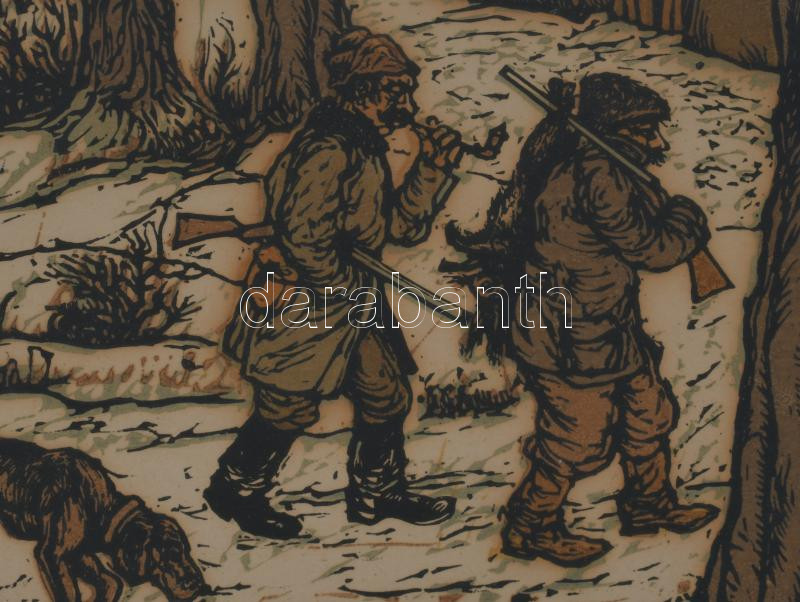 Gácsi Mihály (1926-1987): Vadászok kutyákkal. Színes linómetszet, papír. Jelzés nélkül. Üvegezett fakeretben, 35×52 cm