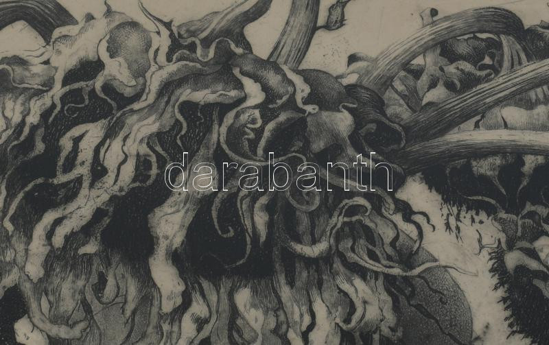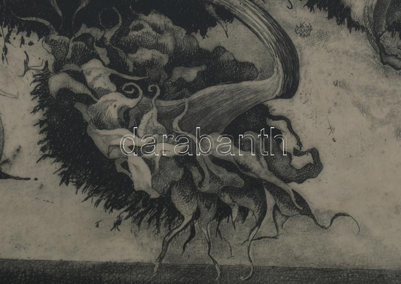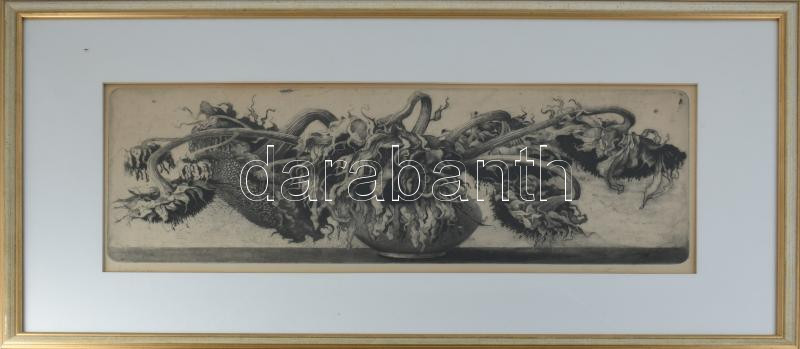 Hertay Mária (1932-2018): Virágok (napraforgó). Rézkarc, papír, jelzett, üvegezett fakeretben, 24×61 cm. Üvegezett fakeretben.