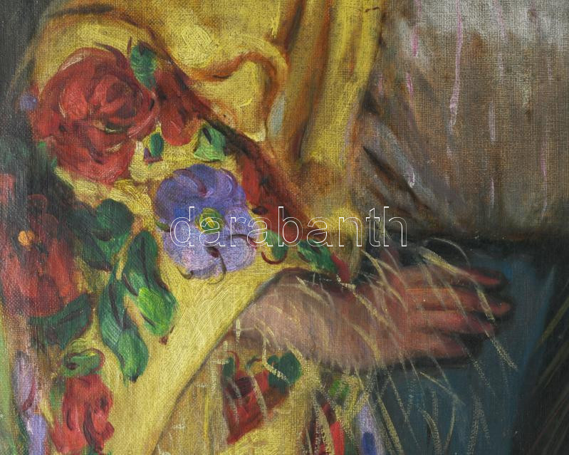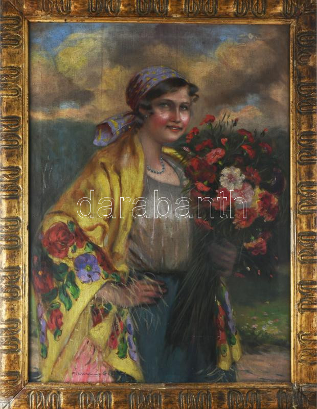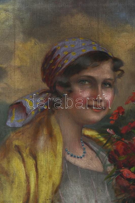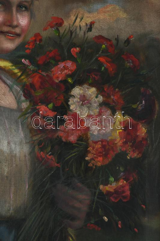 Ivanácz Zsolt József (1869-?): Lány népviseletben és virágokkal. Olaj, vászon. Jelezve balra lent. Javított. Szecessziós, kissé sérült fakeretben. 80x60 cm