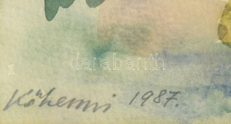 Kőhegyi Gyula (1933-): Tiszai csónakok, 1987. Akvarell, papír. Jelzett. Hátoldalán Képcsarnok Vállalat címkéivel. Dekoratív, üvegezett fakeretben. 31x37,5 cm