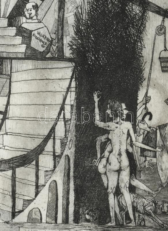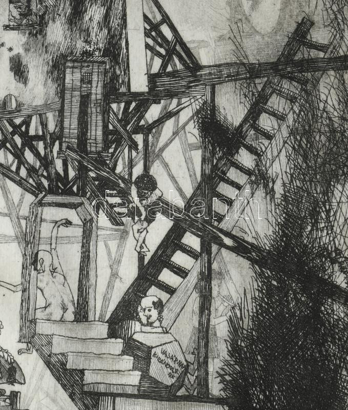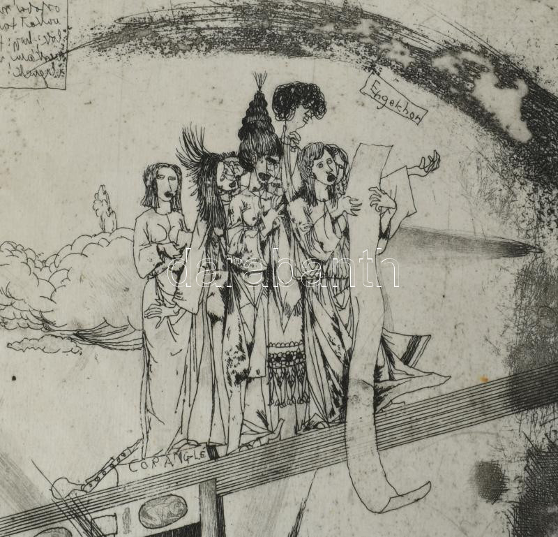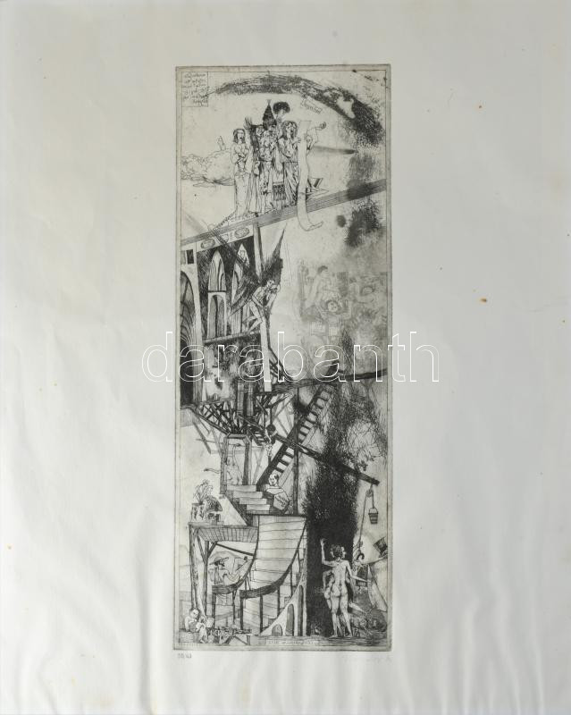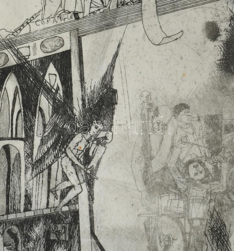 Kondor Béla (1931-1972): Zene hajnaltájt. Rézkarc, papír. Jelzett. Számozott: 50/43. 40x14,5 mm. Lap széle hajtott és kissé foltos.