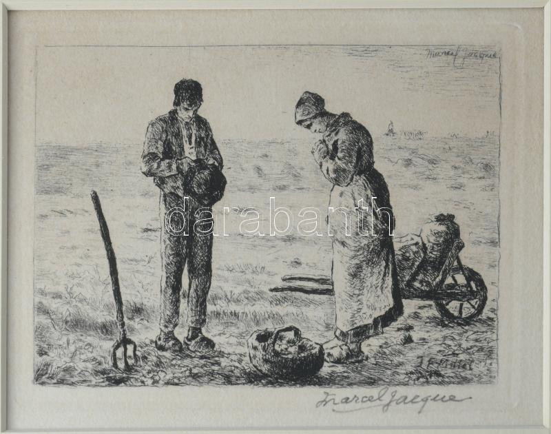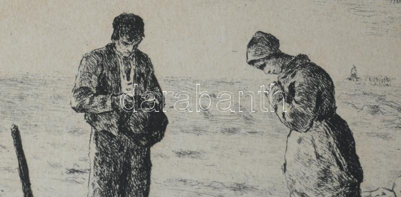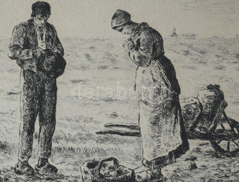 Marcel Jacque (1906-1981), Millet után: Esti ima. Rézkarc, papír. Üvegezett, sérült fakeretben. 9×12,5 cm.
