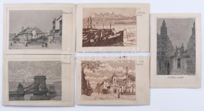 Mátrai Vilmos (1877-?): 5 db, budapesti városrészleteket ábrázoló rézkarca. Jelzettek a nyomaton. kártyák mérete 9x12 cm