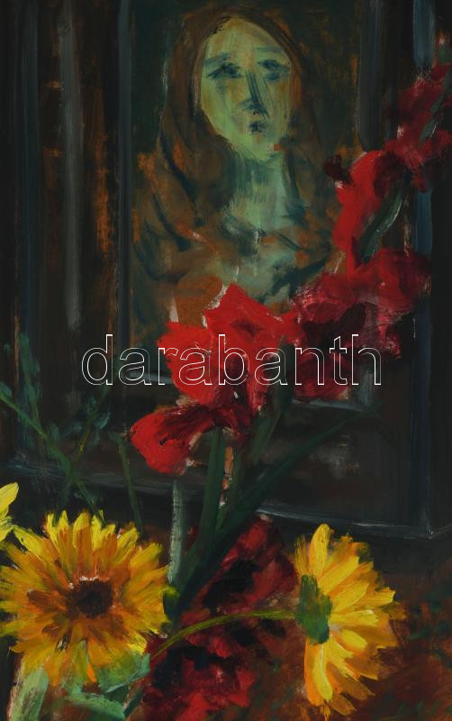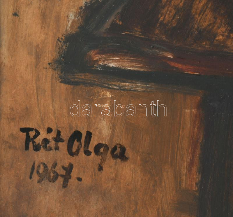 Rét Olga (-): Enteriőr festménnyel és virágokkal, 1967. Olaj, farost. Jelzett 80x60 cm. Fakeretben