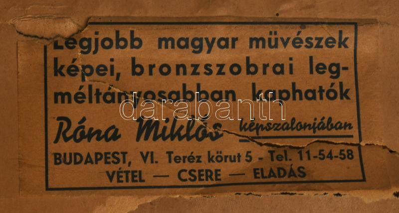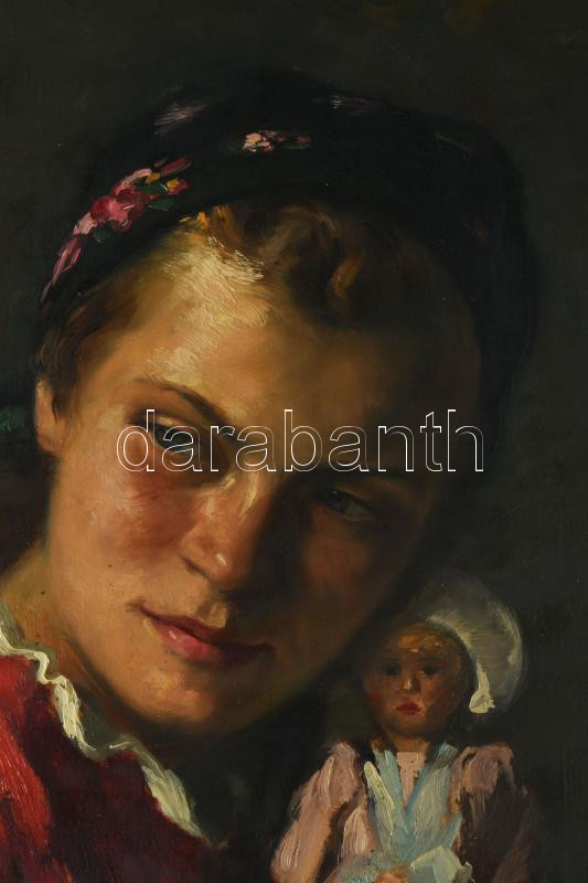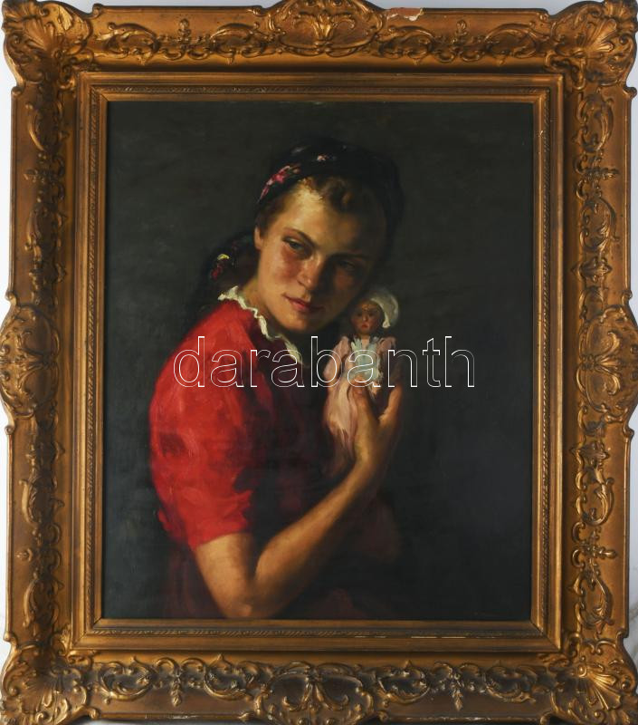 Rezes Molnár Lajos (1896-1989): Lány babával. Olaj, vászon, jelzett. Hátoldalán Róna Miklós Képszalon (Bp., Teréz krt. 5.) 1940 körüli raglapjával. Dekoratív, kissé sérült fakeretben. 65×56 cm
