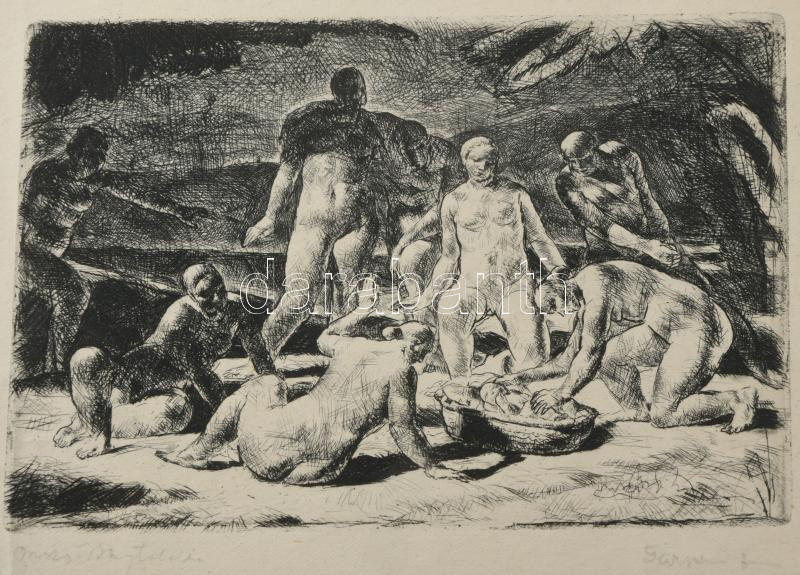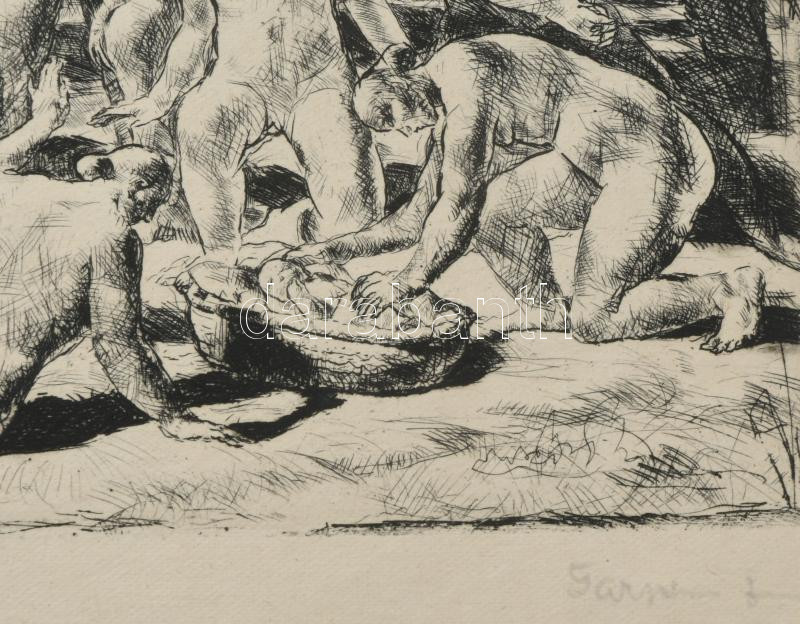 Tarjáni Simkovits Jenő (1895-1995): Mózes megtalálása. Rézkarc, papír, jelzett. Lapszéli hajtásnyomokkal. 12,5×17,5 cm