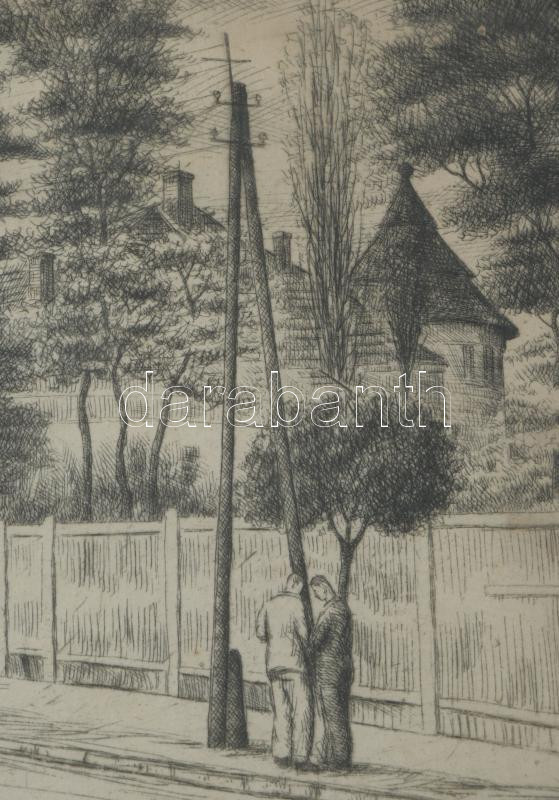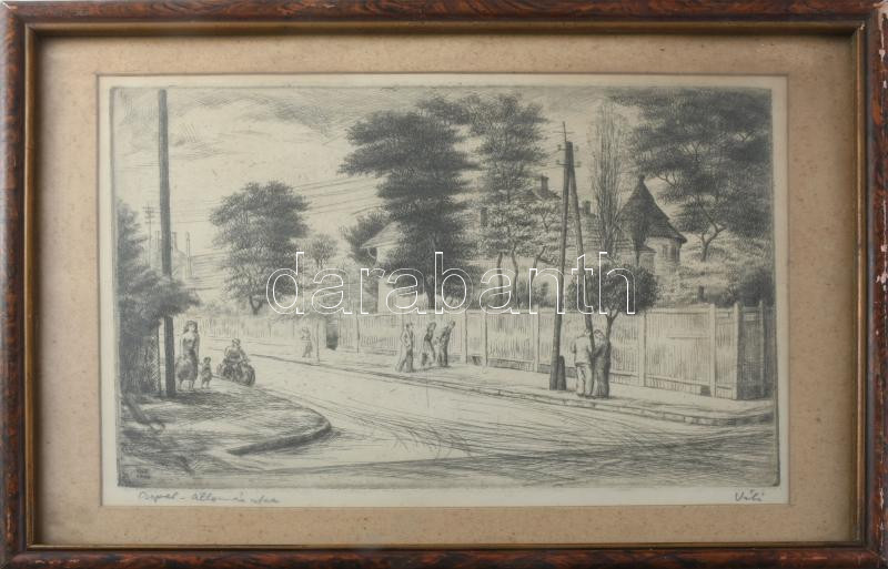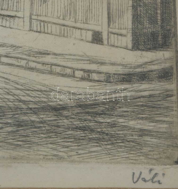 Váli Zoltán (1910-1994): Csepel állomás utca .. Rézkarc, papír, jelzett, számozott 15x32 cm Üvegezett keretben