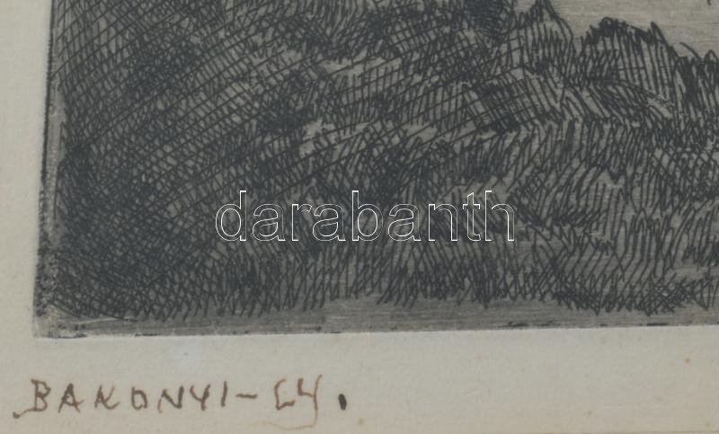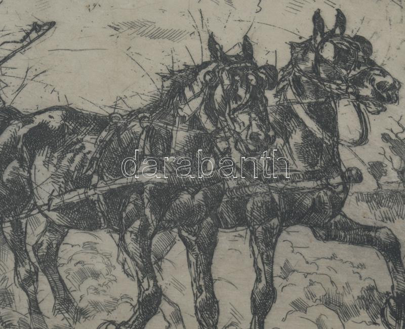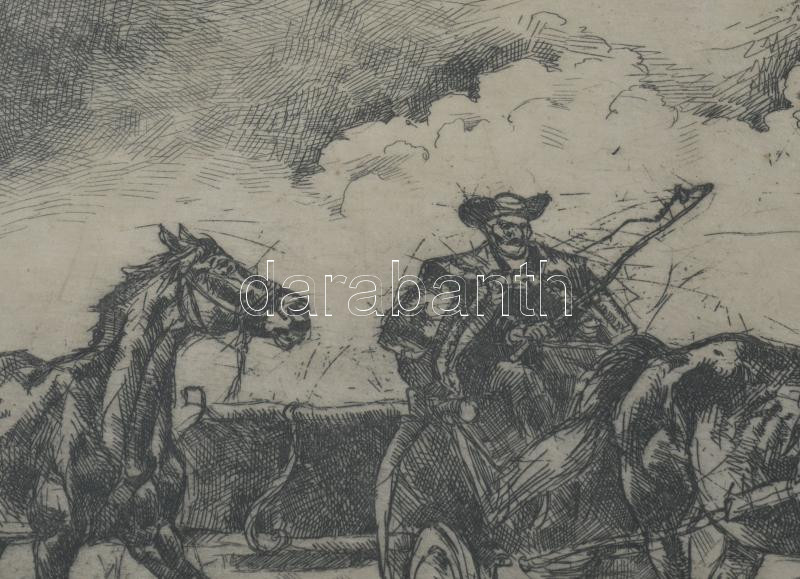 Bakonyi Gy jelzéssel: Lovasszekér. Rézkarc, papír. Üvegezett fakeretben. 18×23,5 cm