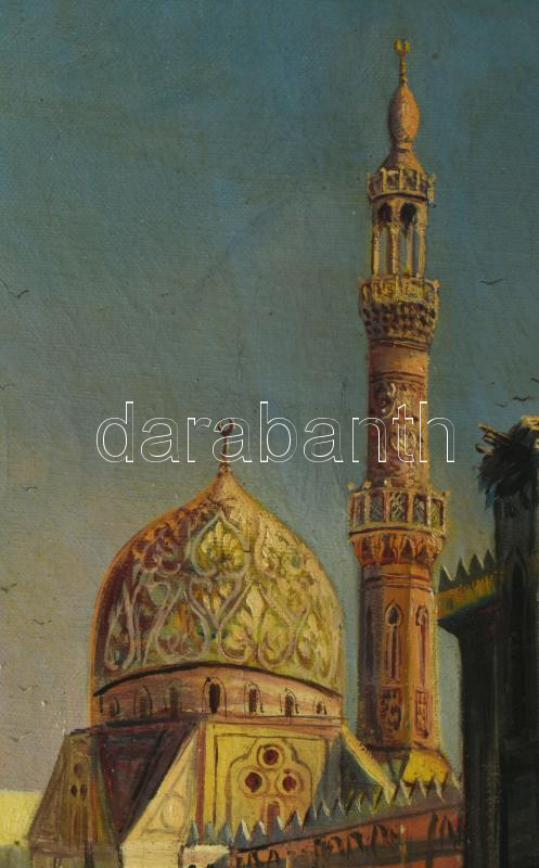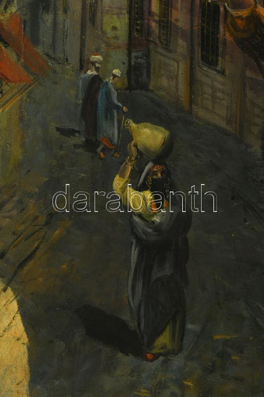 G. Rovello jelzéssel, 1920-1940 körül: Arab utca. Olaj, vászon. Hátoldalán Róna Miklós Képszalon (Bp., Teréz krt. 5.) 1940 körüli raglapjával. Dekoratív fakeretben. 53×42 cm