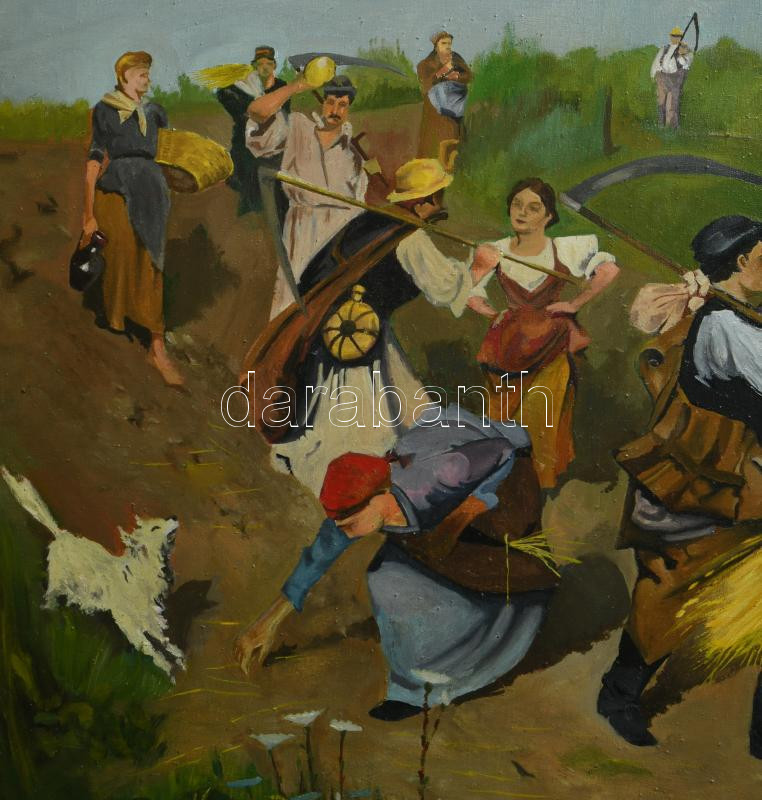 Jelzés nélkül, Deák Ébner Lajos után: Hazatérő aratók. Olaj, vászon. Dekoratív fakeretben. 92×130 cm. KIZÁRÓLAG SZEMÉLYES ÁTVÉTEL, NEM POSTÁZZUK! / ONLY PERSONAL COLLECTION AT OUR OFFICE!