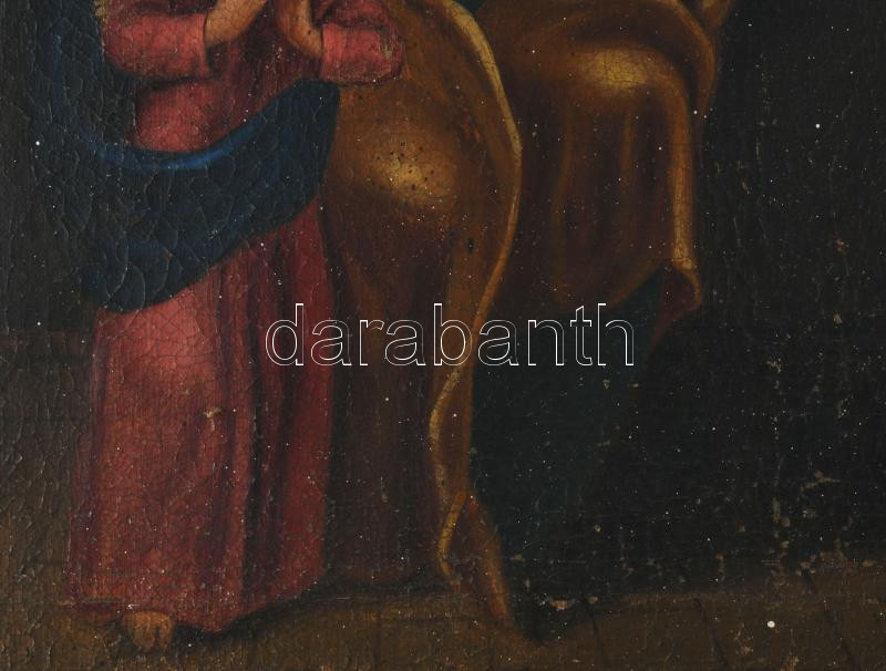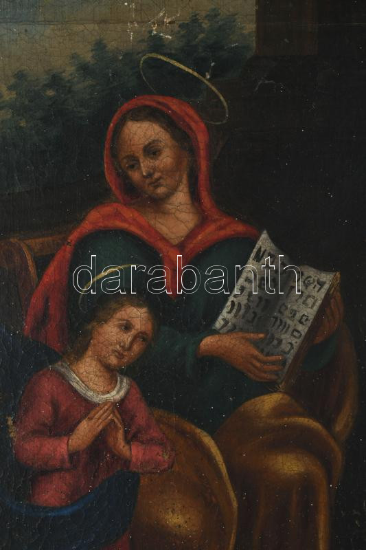 Jelzés nélkül, XIX. sz. festő: Szent Anna olvasni tanítja Szűz Máriát. Olaj, vászon. Sérült. Fakeretben. 41,5×34 cm