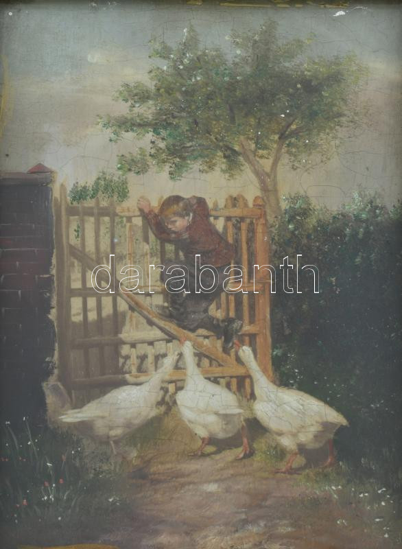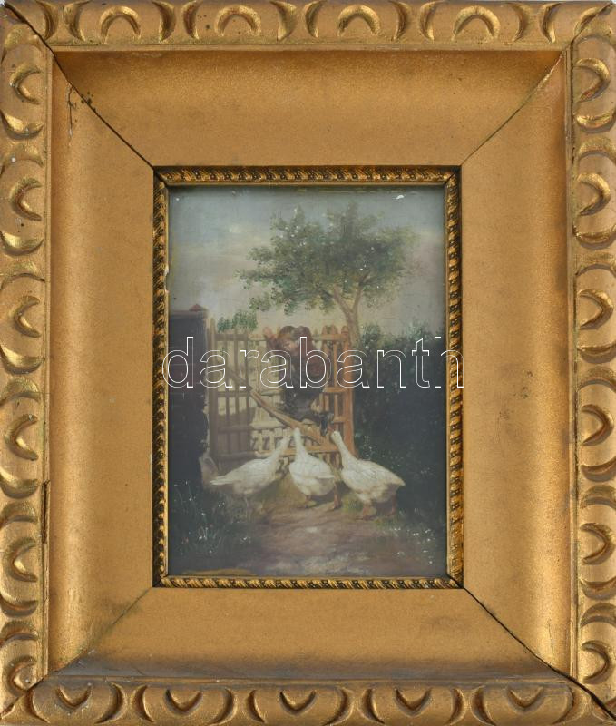 Jelzés nélkül, feltehetően XIX. sz. második fele: Libatámadás. Olaj, fatábla. Dekoratív, üvegezett fakeretben, 20×13,5 cm