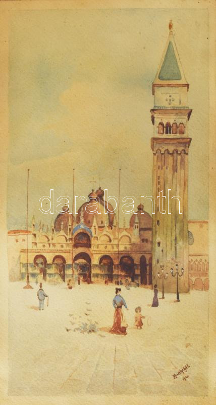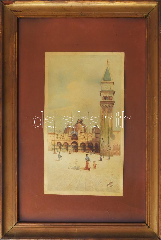 Keszthelyi jelzéssel, XX. sz. eleje: Velence, Szent Márk tér. Akvarell, papír. Üvegezett fakeretben. 24,5x13,5 cm