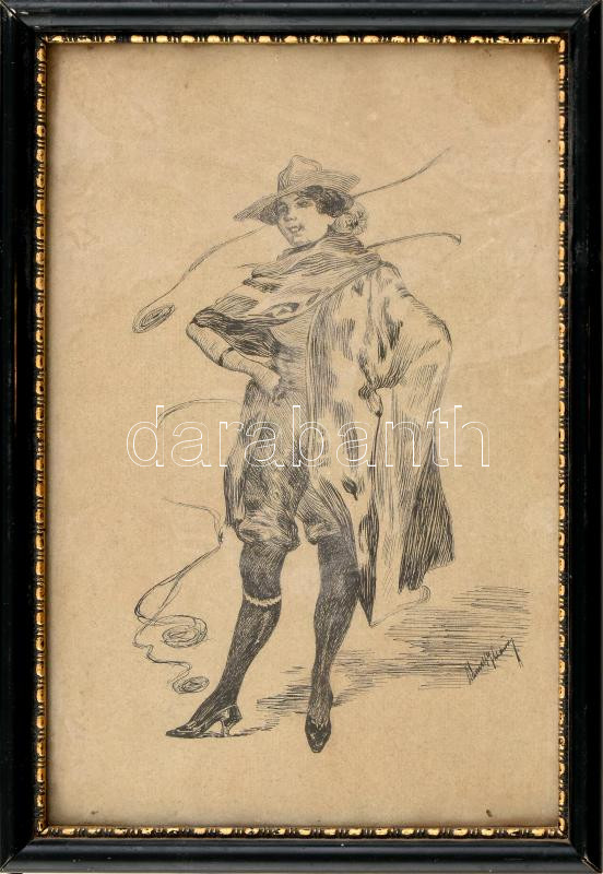 Olvashatatlan (Dániel...?) jelzéssel: Kalapos hölgy, 1910-30 körül. Tus, papír, 25x17cm, üvegezett korabeli fakeretben.