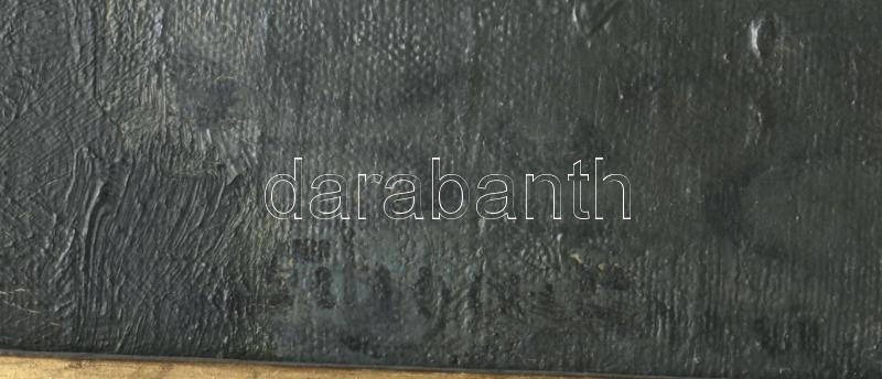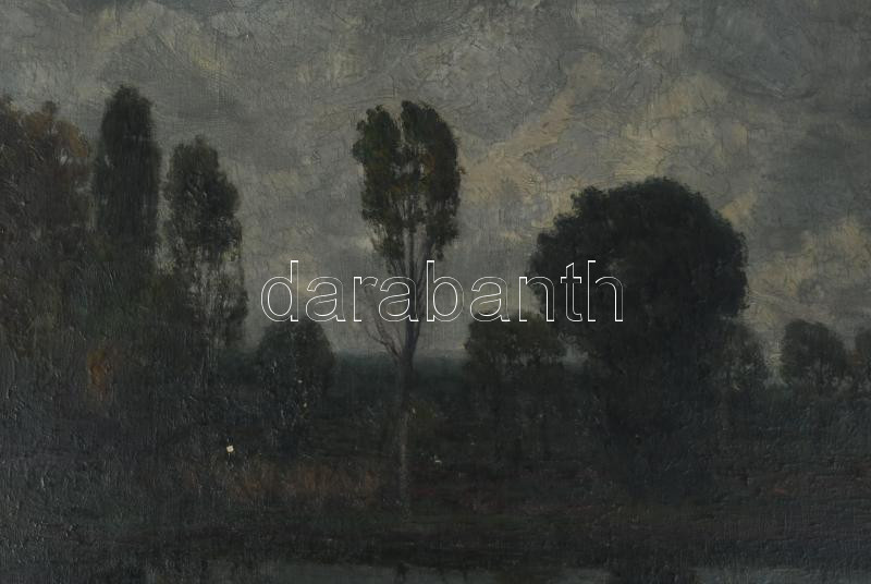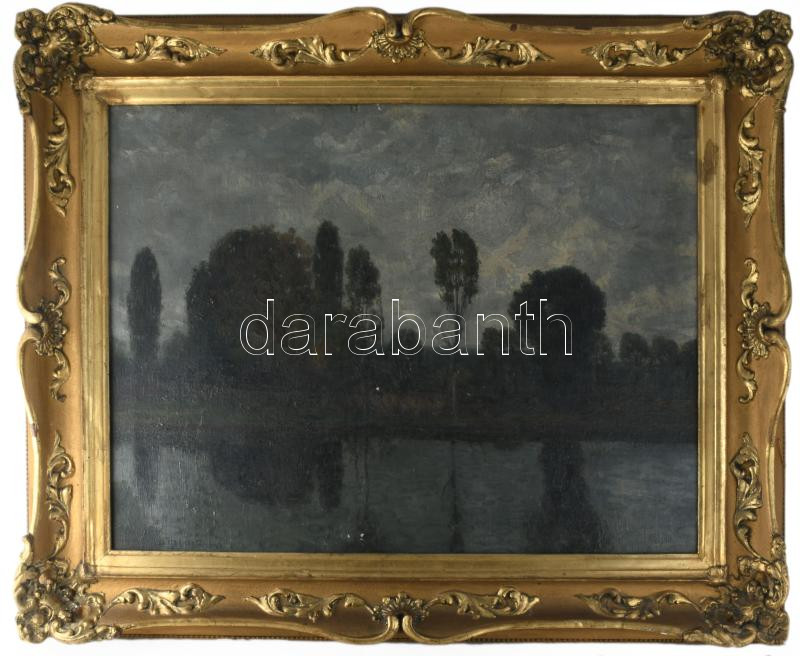 Olvashatatlan jelzéssel (...Ferenc?), XIX. sz. vége/XX. sz. eleje: Folyóparti táj. Olaj, vászon. Hátoldalán 1910-es évekből származó kiállítási raglappal (Műcsarnok?) és Árverési Csarnok raglappal. Apró felületi sérülésekkel. Dekoratív, kissé sérült fakeretben. 60x80 cm. KIZÁRÓLAG SZEMÉLYES ÁTVÉTEL, NEM POSTÁZZUK! / ONLY PERSONAL COLLECTION AT OUR OFFICE!