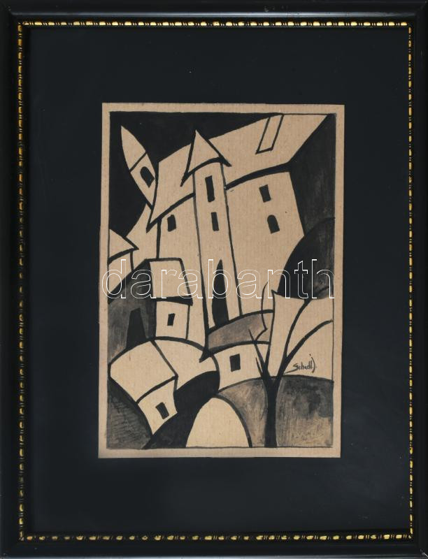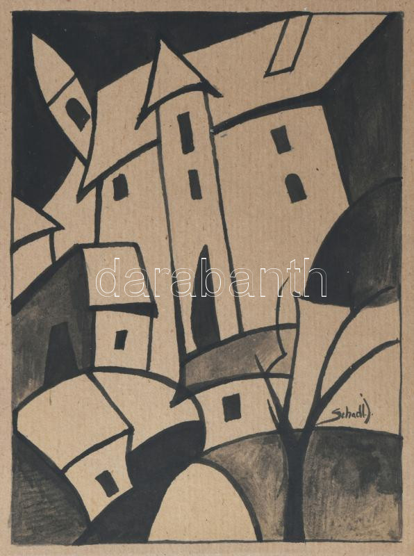 Schadl J jelzéssel: Városrészlet. Tus, papír. Üvegezett fakeretben. 19,5x14,5 cm.