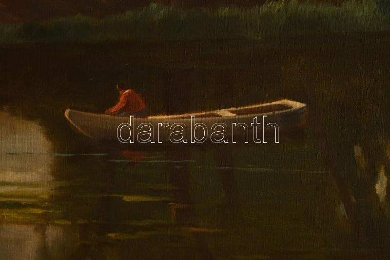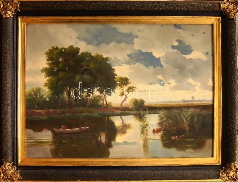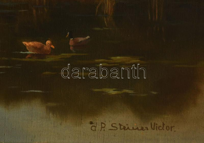 d. P. Steiner Victor jelzéssel, XX. sz. első fele: Vízpart csónakossal és kacsákkal. Olaj, vászon. Dekoratív, kissé kopott fakeretben. 72x100 cm. KIZÁRÓLAG SZEMÉLYES ÁTVÉTEL, NEM POSTÁZZUK / ONLY PERSONAL COLLECTION IN OUR OFFICE!