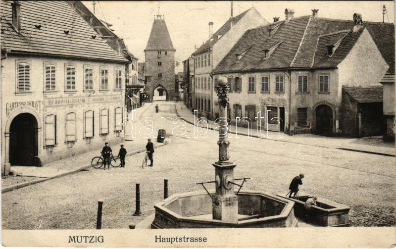 1915 Mutzig, Hauptstrasse / main street, inn, bicycles (EK)