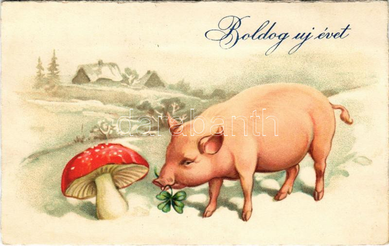 1929 Boldog Újévet / New Year greeting art postcard with pig, clover and mushroom. Amag No. 2351. (EK)
