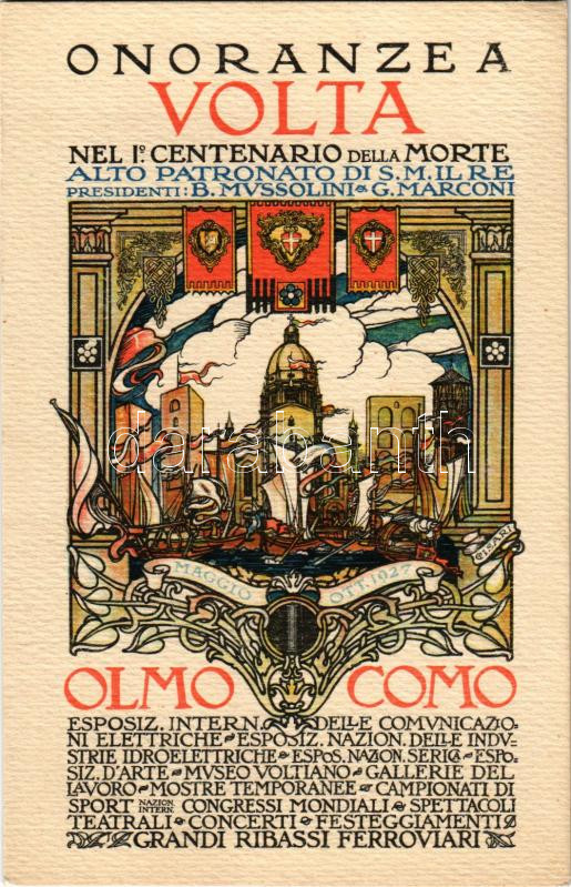 Como, Onoranze a Volta nel 1. Centenario della Morte. Alto patronato di S. M. il re, presidenti B. Mussolini & G. Marconi / Alessandro Volta's Celebrations in the first centenary of his death May-October 1927