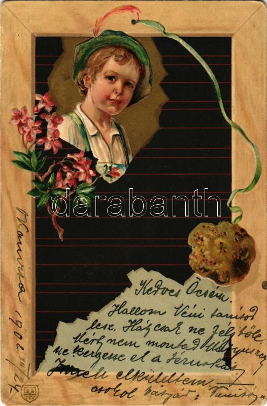 1902 Boy art postcard. Art Nouveal, floral, Emb. litho (lyuk / pinhole)