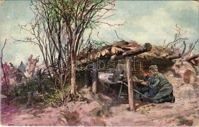 Nisser Otto, Reservefähnrich des Schützenregimentes Nr. 3. Während der Kämpfe am Dniester deckte er am 11. Mai 1915 mit zwei Maschinengewehren den Rückzug des Regimentes mit heldenmütiger Entschlossenheit / WWI K.u.K. military art postcard s: Fr. Jung (EK)