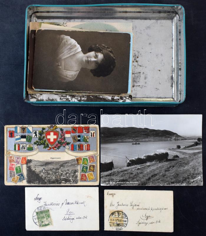 Egy fémdoboznyi MODERN és RÉGI magyar és külföldi város és motívum képeslap, üdvözlőkártya / a metal box of modern and pre-1945 town and motive postcards and greeting cards