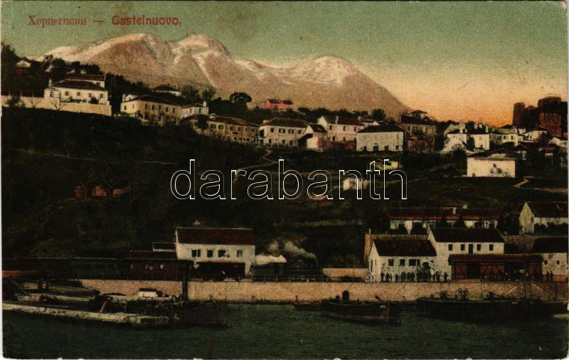 Herceg Novi, Castelnuovo; general view, railway station, train, locomotive, port, steamship, boat. Buchhandlung J. Sekulovic (fl)