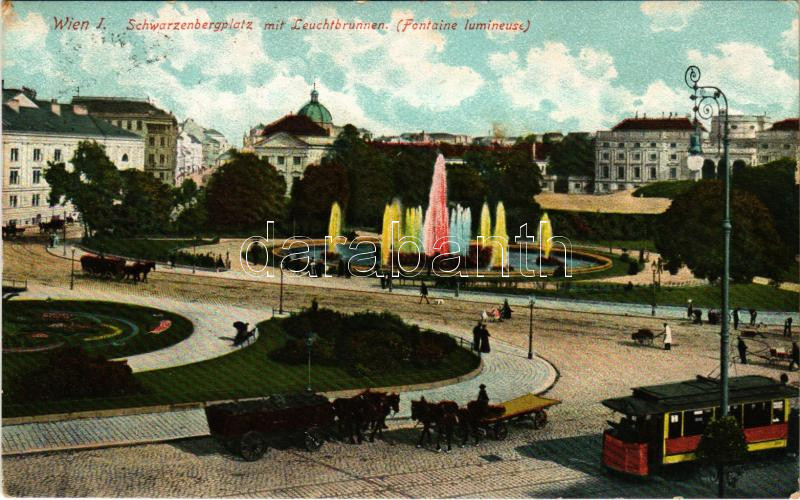 1910 Wien, Vienna, Bécs; Schwarzenbergplatz mit Leuchtbrunnen (Fontaine lumineuse) / square, tram, illuminated fountain (EK)