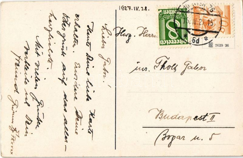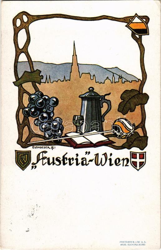 1927 Wien, Vienna, Bécs; Austria-Wien. Pressverein Linz a. D. Akad. Buchdruckerei. Art Nouveau Studentica art postcard with coat of arms and fencing sword s: E. Langeder (EK)
