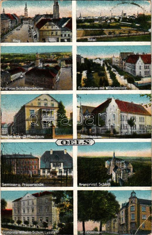 1923 Olesnica, Oels; Ring, Total, Schlosskirchturm, Gymnasium mit Wilhelmplatz, Pfarrhaus, Seminar und Präparandie, Kronprinzl. Schloss, Kronprinz Wilhelm Schule, Lyzeum, Gr. Feldstrasse / multi-view postcard (EB)