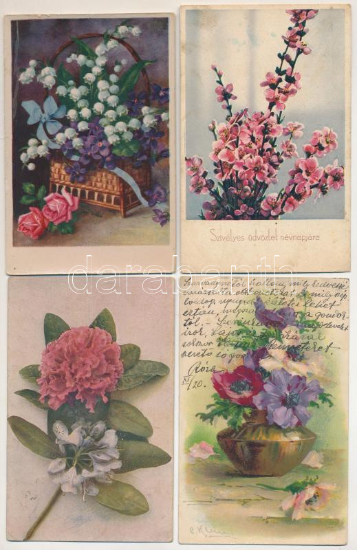 11 db főleg RÉGI motívum képeslap: üdvözlőlapok, virágok; vegyes minőségben / 11 mainly pre-1945 motive postcards: greeting cards, flowers; in mixed quality