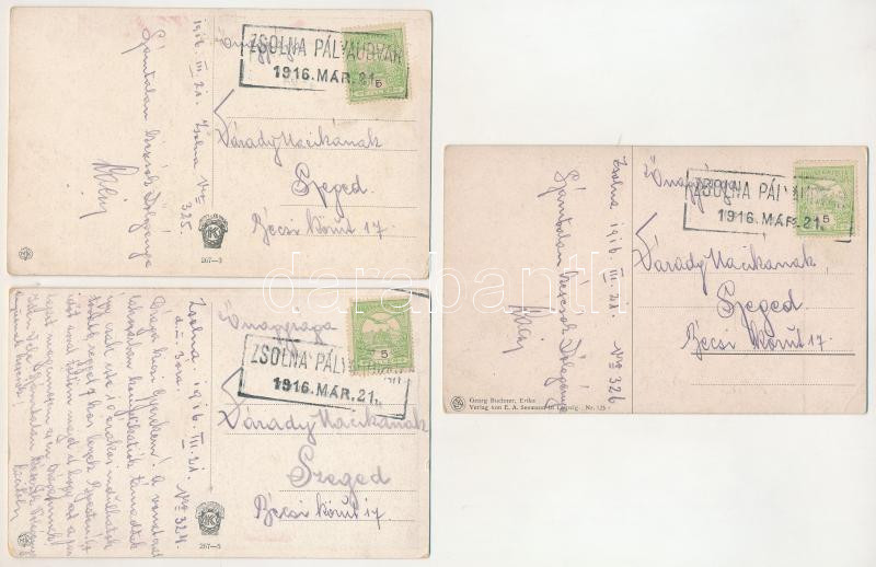 1916 3 db RÉGI képeslap: művészlapok, "Zsolna pályaudvar" bélyegzéssel / 3 pre-1945 art postcards with Zilina stamps