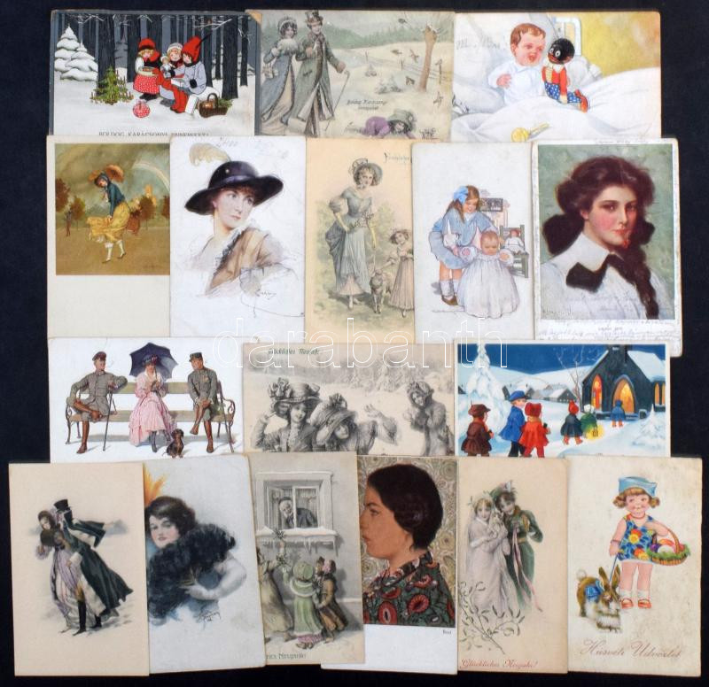 660 db régi üdvözlő és motívum képeslap, érdekes, változatos anyag dobozban