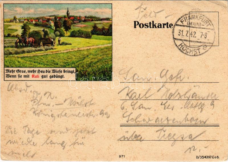 1942 Mehr Gras, mehr Heu die Wiese bringt, wenn sie mit Kali gut gedüngt / Német mezőgazdasági kálium használata, propaganda lap / German agricultural potassium propaganda card. (EK)