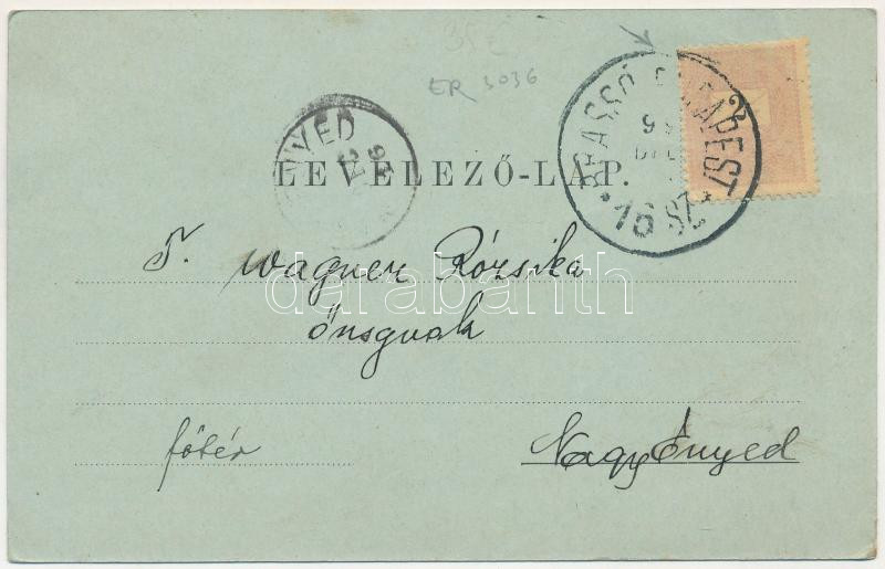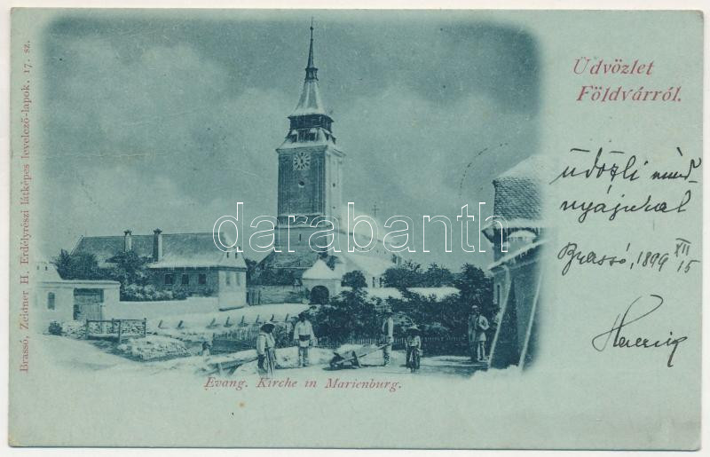 1899 Barcaföldvár, Földvár, Marienburg, Feldioara; Evang. Kirche in Marienburg. Zeidner H. / evangélikus templom télen / Lutheran church in winter + "BRASSÓ - BUDAPEST 16. SZ." vasúti mozgóposta bélyegző (EB)