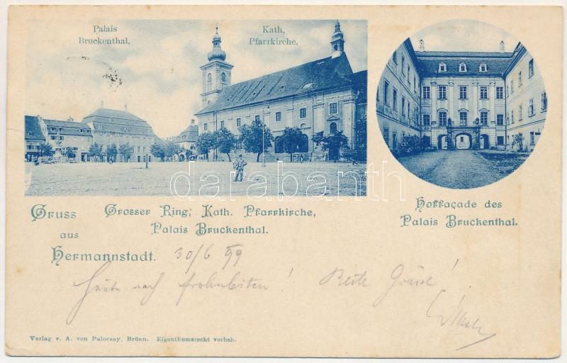 1899 Nagyszeben, Hermannstadt, Sibiu; Brukenthal palota, Római katolikus plébániatemplom, Brukenthal palota udvari homlokzata. A. von Palocsay kiadása / Palais Bruckenthal, Kath. Pfarrkirche, Hoffacade des Palais Bruckenthal / palace, courtyard facade, Catholic parish church (EK)