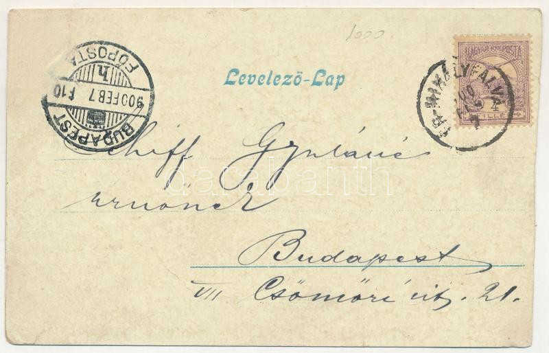 1900 Érmihályfalva, Valea lui Mihai; Református templom, Kaszinó, Kiházasító egyleti iroda, Nemzeti szálloda, Tolnai üzlete. Beck Adolf kiadása, szecessziós-virágos keret / Calvinist church, casino, hotel, shops. Art Nouveau, floral (b)