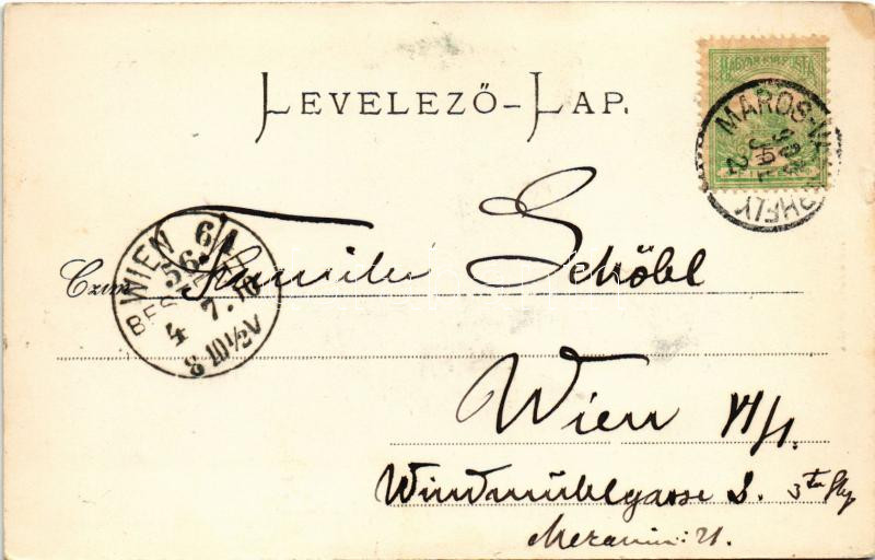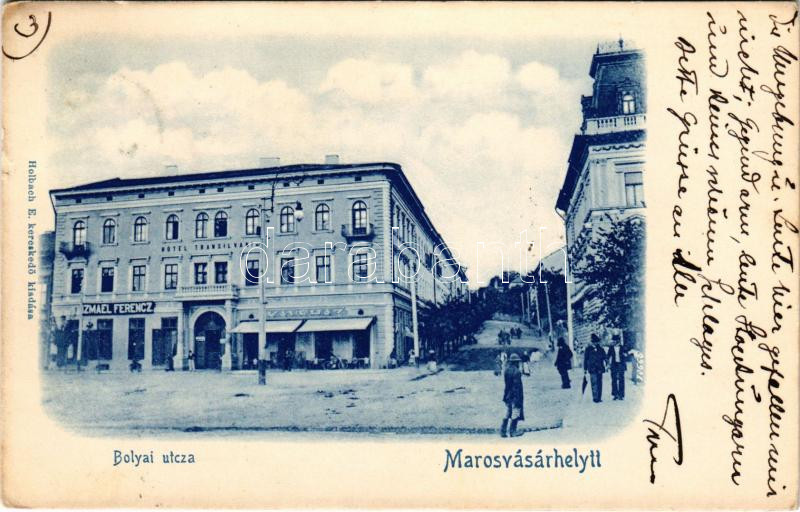 1900 Marosvásárhely, Targu Mures; Bolyai utca, Hotel Transilvania szálloda és kávéház, Izmael Ferenc üzlete. Holbach E. kiadása / street view, hotel and café, shops (kis szakadás / small tear)