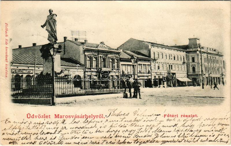 1900 Marosvásárhely, Targu Mures; Fő téri részlet, Návay Bogdán, Izmael János, Kondray János, Tánczos Gyula üzlete, Központi szálloda, Csizmakészítő Társulat, Hotel Transilvania szálloda és kávéház, Gyógyszertár. Holbach Ede kiadása / square, shops, hotel, café, pharmacy (EB)