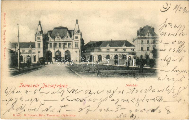 1900 Temesvár, Timisoara; Indóház, vasútállomás, villamos. Bernard E. fényképész felvétele, Králicsek Béla kiadása / railway station, tram (EK)