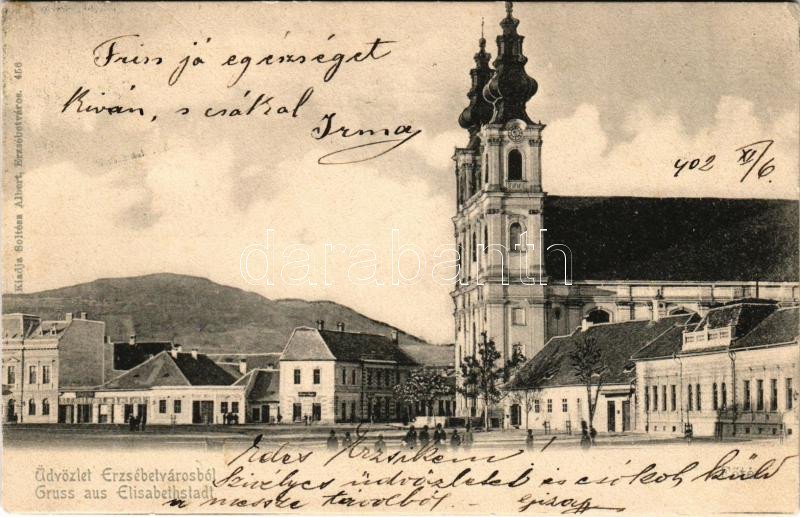1902 Erzsébetváros, Dumbraveni; Fő tér, templom. Soltész Albert kiadása / main square, church (EK)